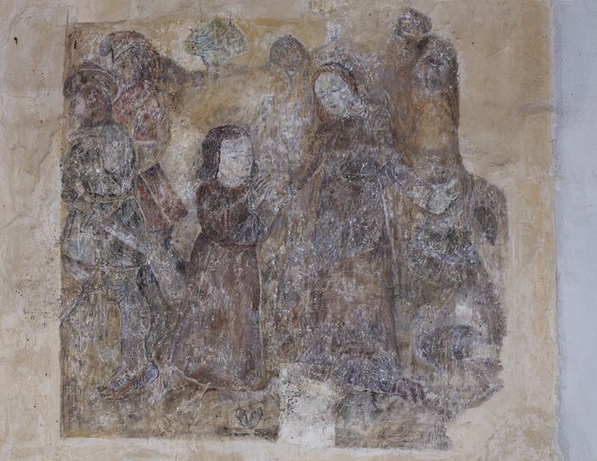 Peinture murale 4 : jeune homme à genoux, priant, devant une femme, bras écarté, 2 soldats leur tournent le dos (état en 2010)Immatriculation