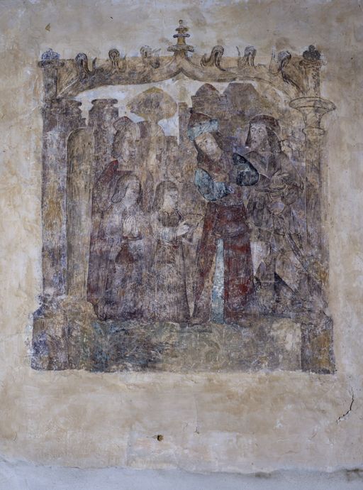 Peinture murale 7 : 6 personnages dont deux en prière ; à l'arrière-plan, une ville (?) (état en 2010)Immatriculation