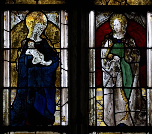 Verrière de la baie 1, Vierge à l'Enfant et sainte : vue rapprochée (état en 2010)Immatriculation