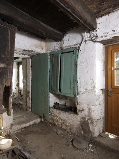 Etable, partie habitable à l'est, évier et placard mural, porte de communication avec la salle ouest du logisImmatriculation