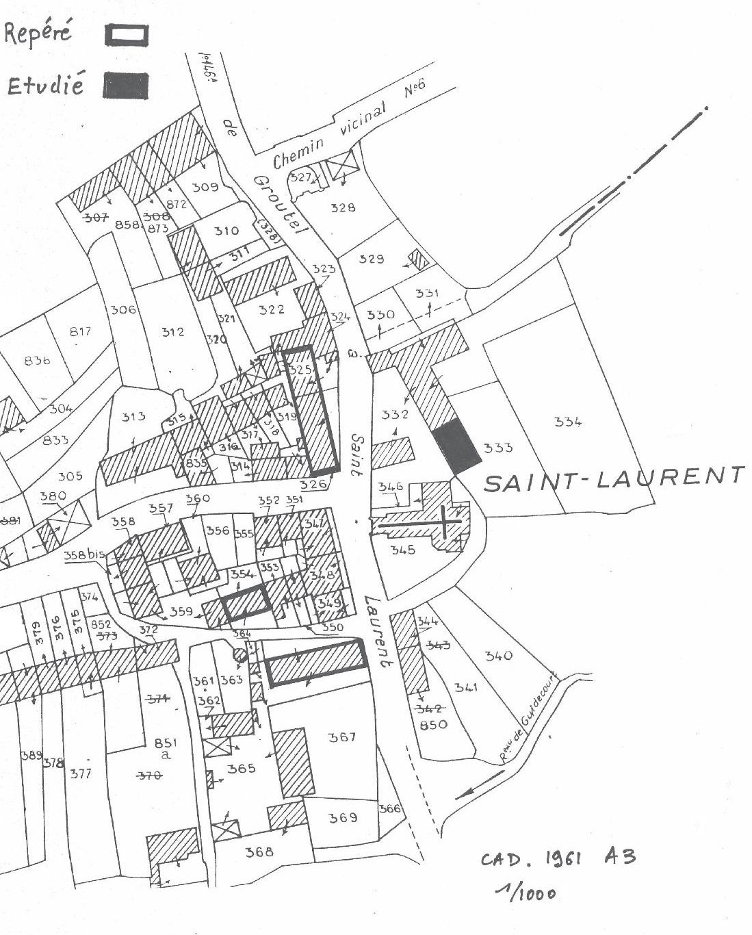Carte des maisons repérées au bourg sur le cadastre de 1961, A3, 1:1000e (J. -P. Ducouret, 1979)Immatriculation