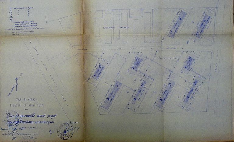 Plan d'ensemble avant-projet des constructions économiques, terrain Saint-Guen par Romualdo-Hautefage, 1951. AM Vannes 5M204.Immatriculation