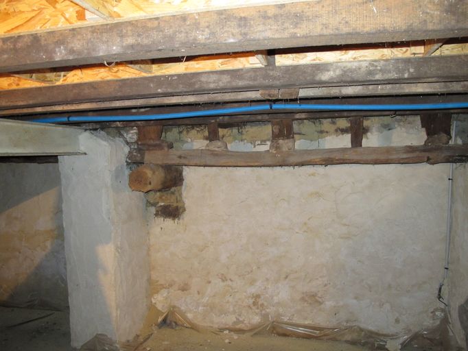 Sous-sol, corps principal, pièce médiane, vue vers le sud : poutres soutenant le plancherImmatriculation