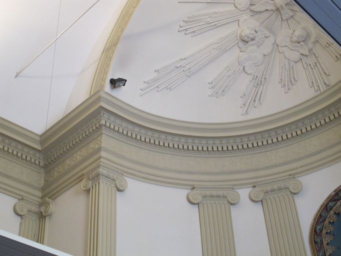 Choeur, abside semi-circulaire, décor et pilastres ioniquesImmatriculation