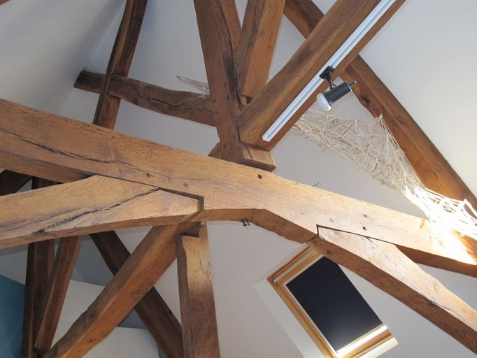 Aile nord, ancienne salle des malades, grenier : charpente 15e siècle, détail d'assemblageImmatriculation