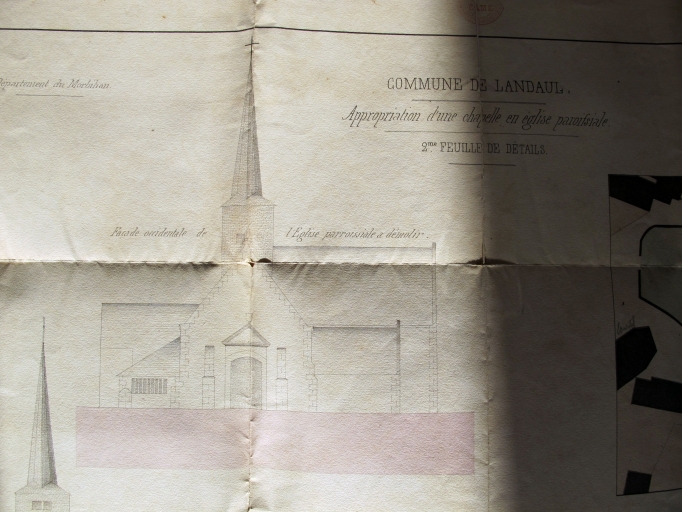 Etat des édifices religieux de la place du bourg ; élévation ouest de l 'église par Amé, architecte du département, 1861. (AD Morbihan 2O 93)Immatriculation