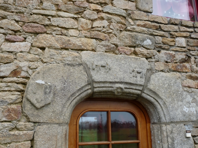 Kerguen, ferme ZI 494 : linteau sculpté d'unn blason et de moutonImmatriculation