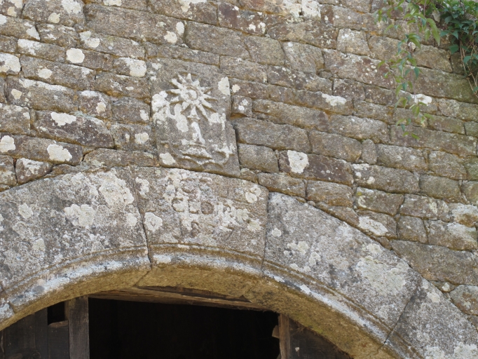 Branjouan, grange datée 1827, détail décor ostensoir et chandeliers et inscriptionImmatriculation