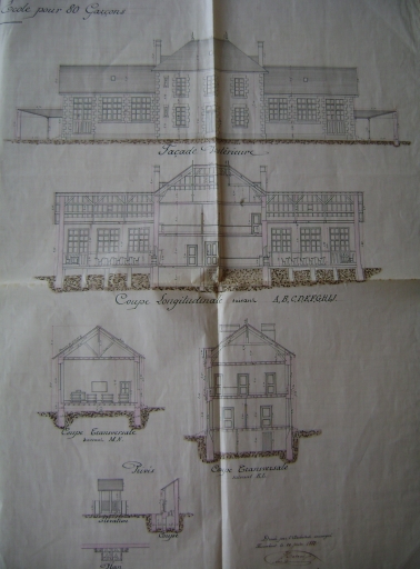 Plan au sol et élévation, façade postérieure (10 juin 1882, Mr. Halouis architecte 2O148/6. AD Morbihan)Immatriculation
