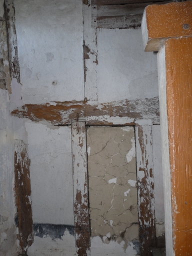 Détail de la structure ancienne du mur de la cage d'escalier : treillis de bois comblé par du torchis et de la pierreImmatriculation