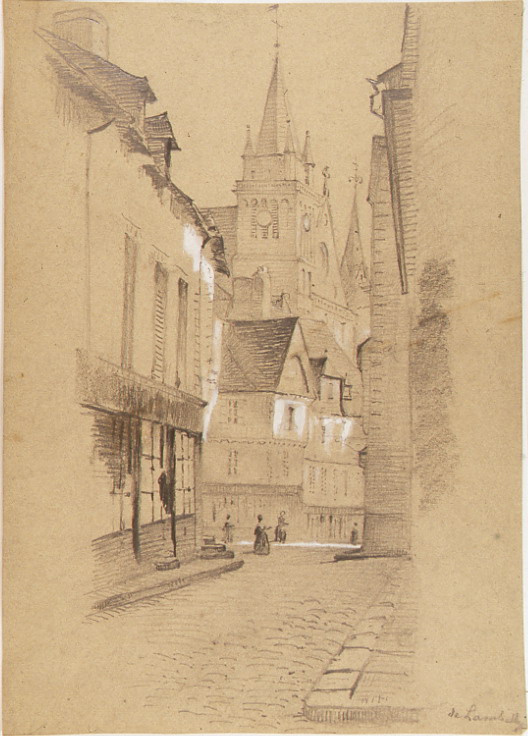 Vue vers la cathédrale (à gauche 14 rue Emile Burgault). Dessin par Charles de Lambilly, milieu 19e siècle. Musée des Beaux-Arts, Vannes.Immatriculation