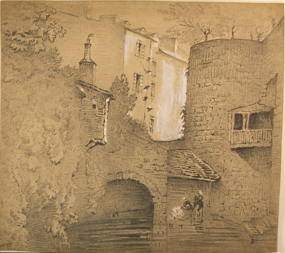Vue de la porte Calmont. Dessin par Charles de Lambilly, milieu 19e siècle. Musée des Beaux-Arts, Vannes.Immatriculation