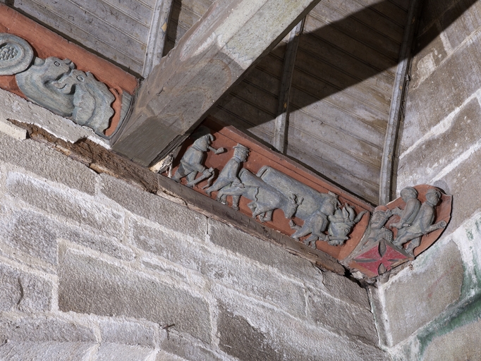 Loguivy-Plougras, le bourg : vue intérieure de l'église paroissiale Saint-Emilion, nef, au dessus de la tribune, sablière sculptéeImmatriculation