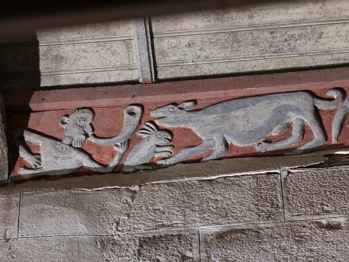 Loguivy-Plougras, le bourg : vue intérieure de l'église paroissiale Saint-Emilion, nef, sablière sculptéeImmatriculation