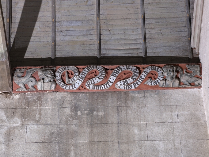 Loguivy-Plougras, le bourg : vue intérieure de l'église paroissiale Saint-Emilion, transept sud, sablière sculptéeImmatriculation