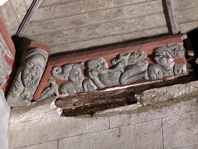Loguivy-Plougras, le bourg : vue intérieure de l'église paroissiale Saint-Emilion, nef, sablière sculptéeImmatriculation