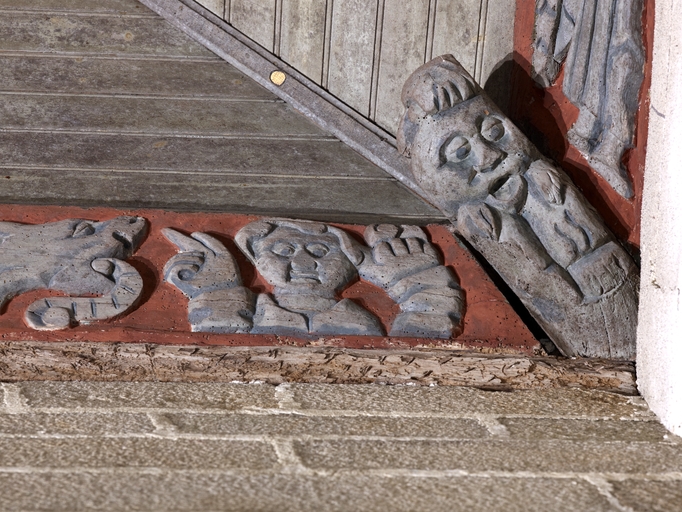 Loguivy-Plougras, le bourg : vue intérieure de l'église paroissiale Saint-Emilion, nef, sablière sculptéeImmatriculation