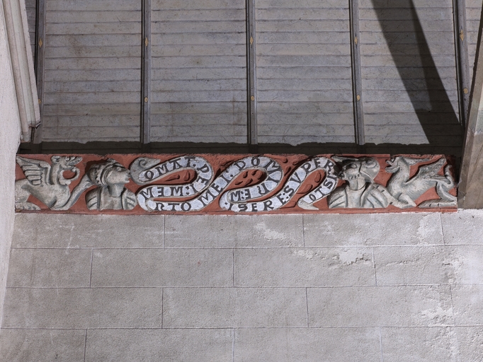 Loguivy-Plougras, le bourg : vue intérieure de l'église paroissiale Saint-Emilion, transept sud, sablière sculptéeImmatriculation