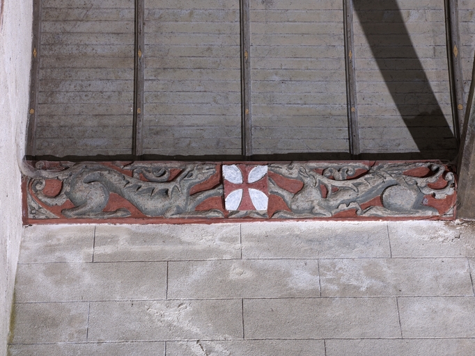 Loguivy-Plougras, le bourg : vue intérieure de l'église paroissiale Saint-Emilion, transept sud, sablière sculptéeImmatriculation