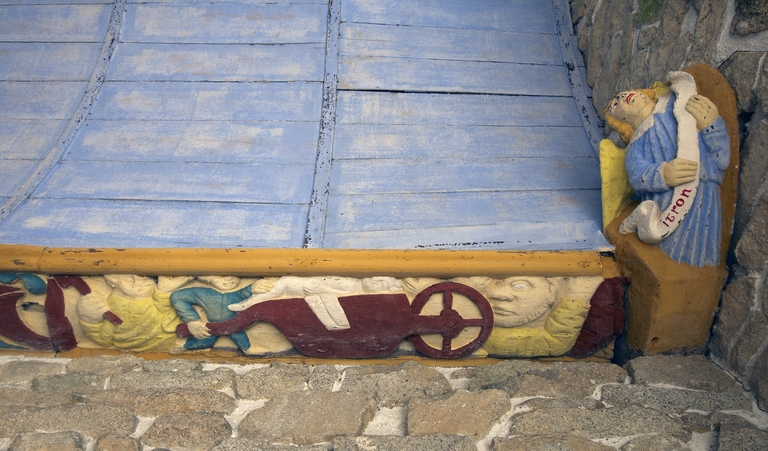 Plougras, le bourg : église paroissiale Saint-Pierre, vue de la sablière, le mort emporté en brouetteImmatriculation