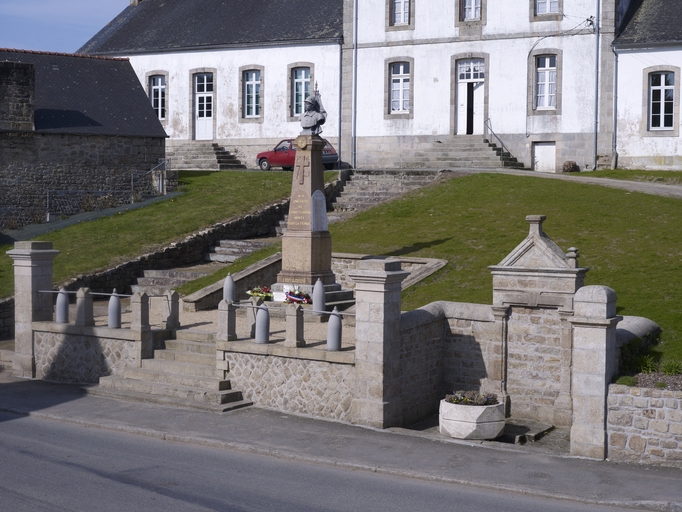 Loguivy-Plougras, le bourg : monument aux morts et fontaine. En arrière-plan, l'ancienne mairie-écoleImmatriculation