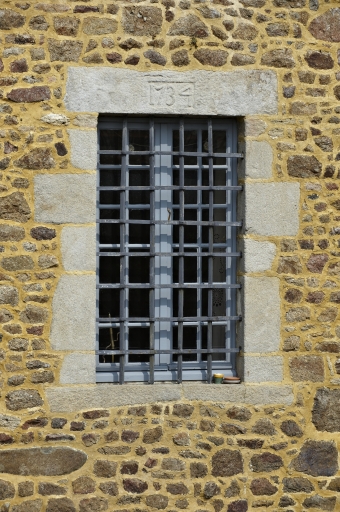 Fenêtre à grilles du rez-de-chaussée avec linteau portant la date de 1734Immatriculation