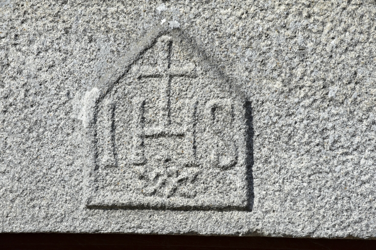 Détail, linteau de la porte, détail du blason sculpté : IHSImmatriculation