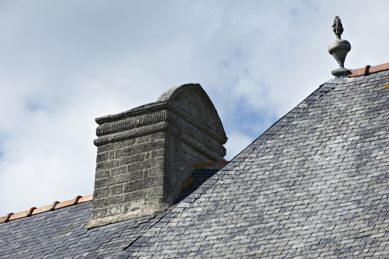 Détail, souche de cheminée à double conduit en pierre des falunsImmatriculation