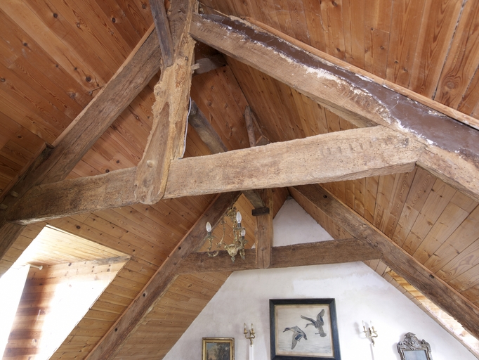Pluzunet, Coat Nizan : manoir puis ferme, vue intérieure, ancienne charpenteImmatriculation