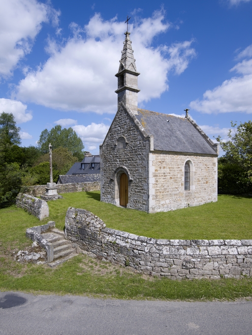 Pluzunet, Saint-Idunet : chapelle, vue générale depuis le sud-ouest et croix monumentale (socle daté 1743)Immatriculation