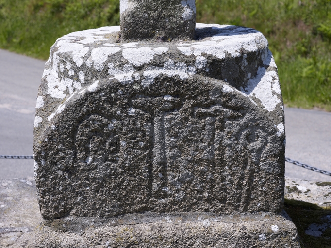 Pluzunet, Porz an Goff : calvaire, détail du socle et de ses inscriptionsImmatriculation