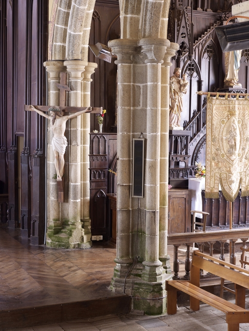 Pluzunet, le bourg, place Marc'harit Fulup : église paroissiale Saint-Pierre, vue intérieure, pilier de la croisée du transept sudImmatriculation