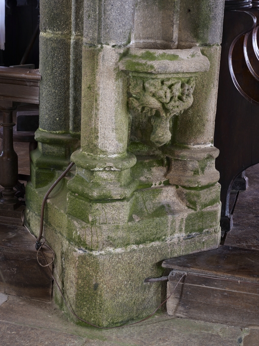 Pluzunet, le bourg, place Marc'harit Fulup : église paroissiale Saint-Pierre, vue intérieure, pilier de la croisée du transept nord, détail du bénitierImmatriculation
