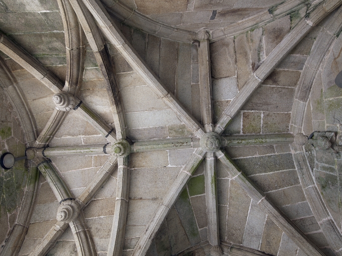 Pluzunet, le bourg, place Marc'harit Fulup : église paroissiale Saint-Pierre, vue intérieure, voûte du porche sudImmatriculation