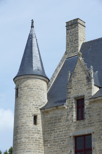 Façade antérieure, angle sud-ouest, partie haute de la tourelle d'escalier, souche de cheminée, lucarneImmatriculation