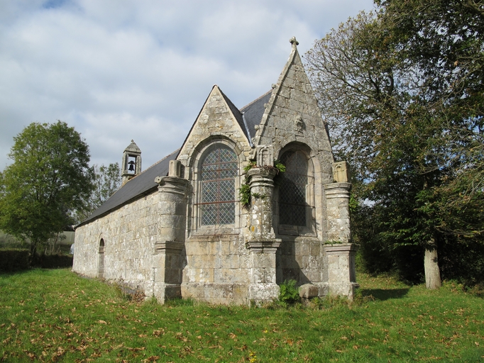 Le Vieux-Marché, La Trinité : chapelle de La Trinité, vue sud-est, chevet à noues multiples avec contreforts circulaires à socle carré, ornés de pinacles, et canonnière formant gargouillesImmatriculation