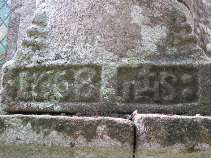 Le Vieux-Marché, La Trinité : chapelle, détail de l'inscription sur l'un des quatre contreforts. 1668 IHSImmatriculation