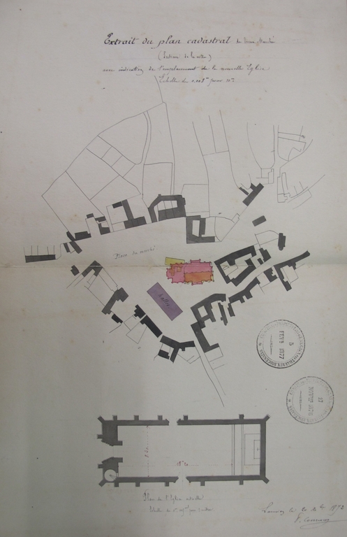 Le Vieux-Marché, le bourg, place Angela Duval : église paroissiale Notre-Dame-de-Consolation, extrait du plan cadastral et plan, 1872, tampons du comité des inspecteurs généraux des travaux diocésains, Archives départementales des Côtes-d'ArmorImmatriculation