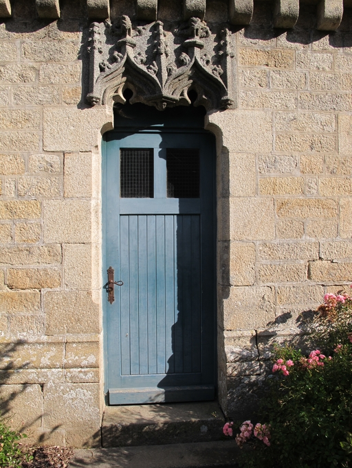 Le Vieux-Marché, le bourg, place Angela Duval : église paroissiale Notre-Dame-de-Consolation, sacristie, détail de la porte reprenant un élément ancien gothique flamboyantImmatriculation