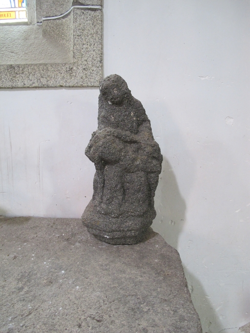 Le Vieux-Marché, le bourg, place Angela Duval : église paroissiale Notre-Dame-de-Consolation, vue intérieure, Pietà en granite (la Vierge Marie pleurant son enfant qu'elle tient sur ses genoux)Immatriculation