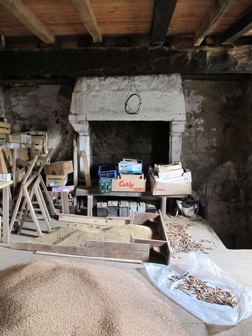 Le Vieux-Marché, Kerdoualen : ferme, vue intérieure, étage, cheminée sur le mur est. L'étage sert aujourd'hui au stockage de grainImmatriculation
