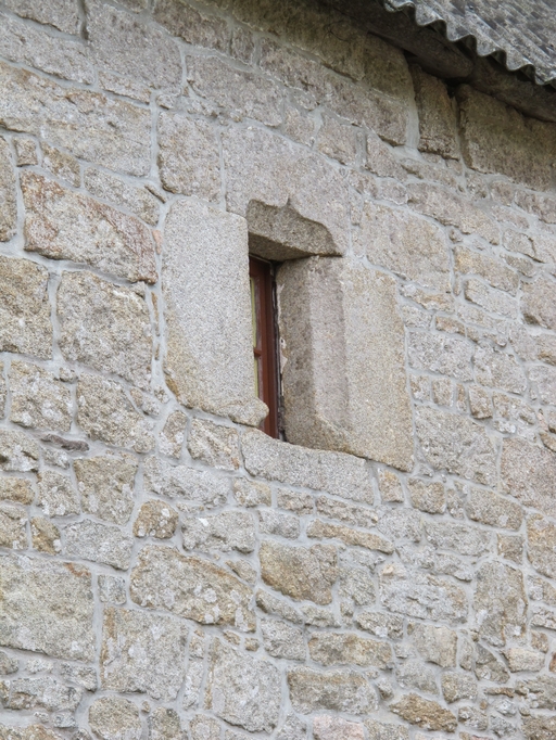 Le Vieux-Marché, Launay : manoir ( ?), façade postérieure nord, étage détail de l'ouverture. Linteau délardé avec décor à accoladeImmatriculation