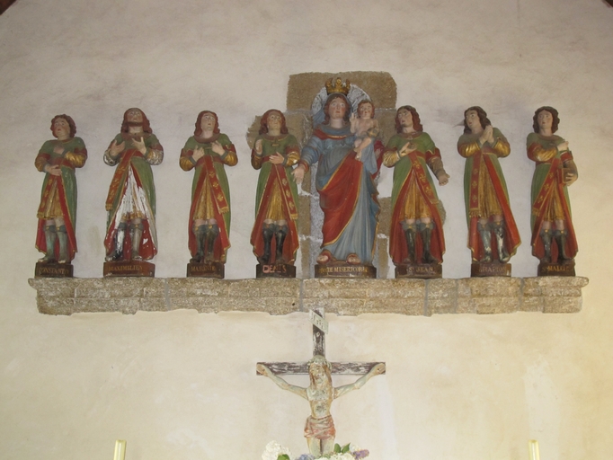 Le Vieux-Marché, les Sept Saints : chapelle, vue intérieure, le chœur. Statues représentant Notre-Dame-de-Miséricorde entourée sept Saints (Maximilien, Marc, Martinien, Denis, Jean, Séraphin et Constantin)Immatriculation