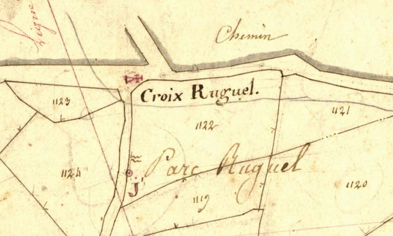 Extrait de la feuille F3 du cadastre ancien de la commune de Le Vieux-Marché, 1835 : croix RuguelImmatriculation