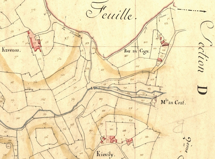Extrait de la feuille D3 du cadastre ancien de la commune de Le Vieux-Marché, 1835 : Milin ar C'hoatImmatriculation