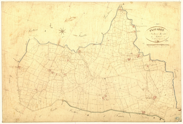 Cadastre ancien, commune de Plouaret, 1 tableau d'assemblage et 15 feuilles, 1835.Cadastre.