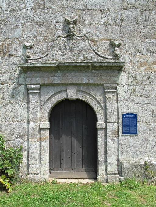 Plounévez-Moëdec : chapelle Sainte-Jeune, porte plein cintre encadrée de pilastres supportant un entablement formant larmier et un fronton en accolade orné de trois calicesImmatriculation