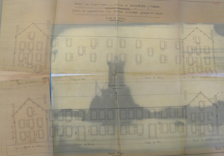 Plounévez-Moëdec, le bourg : projet de construction d'un groupe scolaire Garçons et Filles, plan de détail, élévation des façades nord et sudImmatriculation