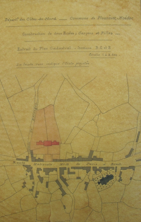 Plounévez-Moëdec, le bourg : construction de deux écoles : Garçons et Filles, extrait du plan cadastralImmatriculation