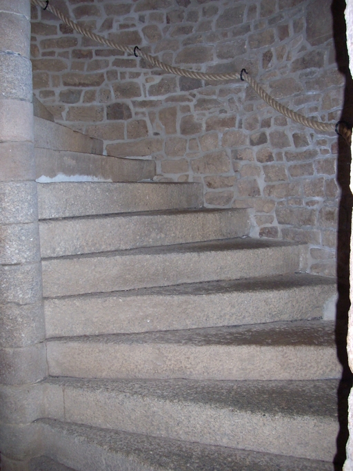 Plounévez-Moëdec, Keramel : manoir, vue intérieure, escalier en vis dans l'angle en façade antérieureImmatriculation